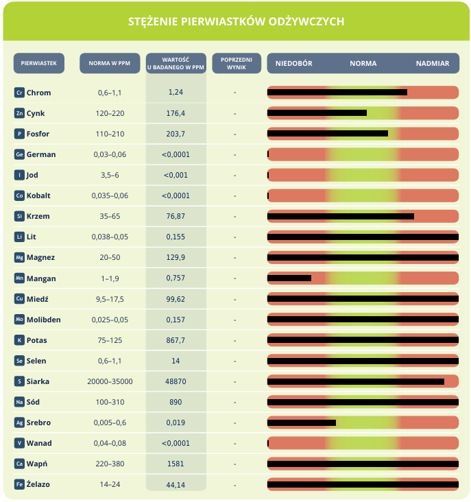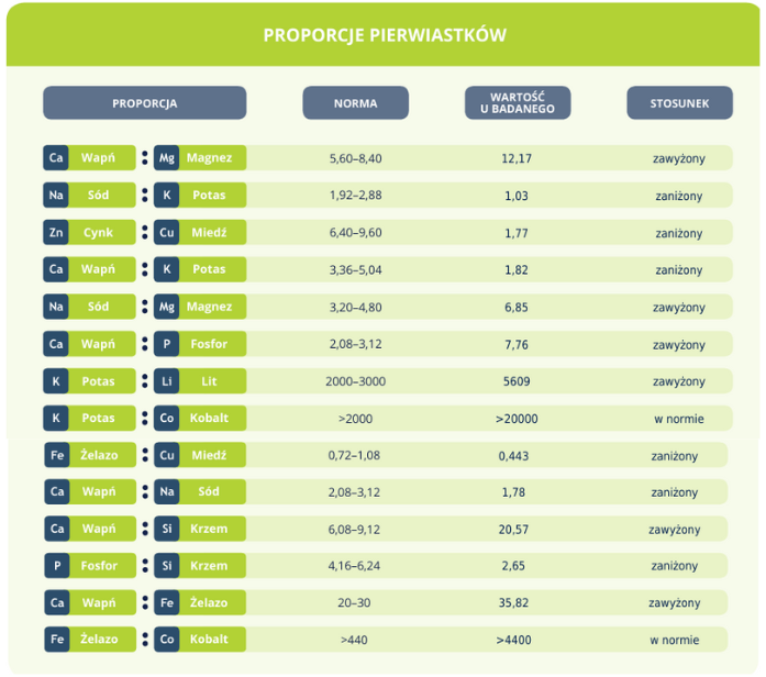 - Wapń (Ca) – wysoki poziom sugeruje odkładanie wapnia w tkankach, niedobór może oznaczać problemy z kośćmi, zębami, układem nerwowym.