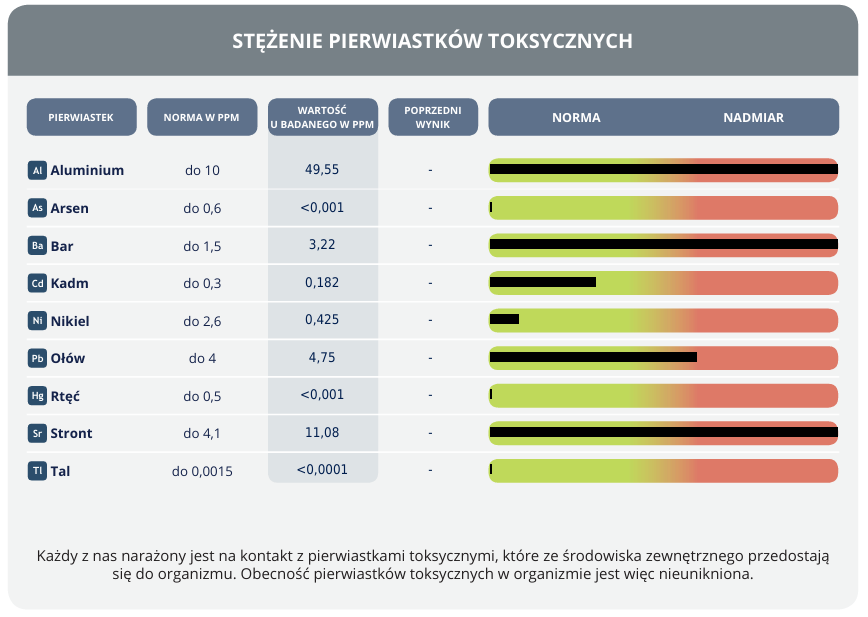 Nadmiar metali toksycznych wskazuje na przewlekłą ekspozycję, której często nie wykrywają badania krwi (bo metale odkładają się w tkankach)